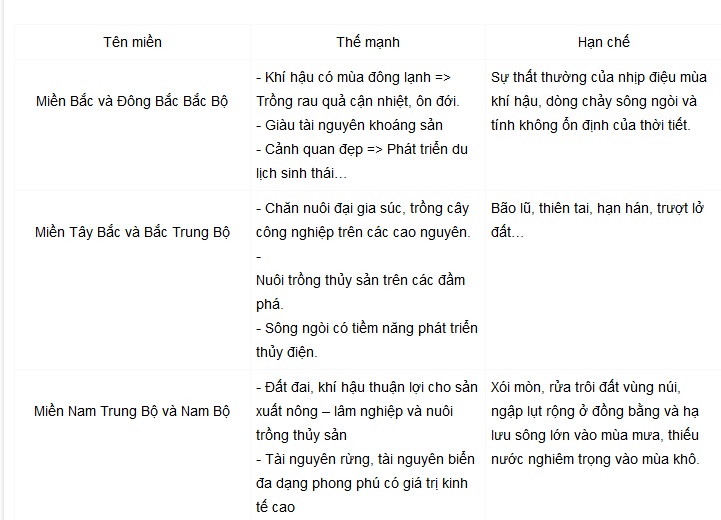 Câu 3: Hãy lập bảng nêu các thế mạnh về tài nguyên và hạn chế đối với phát triển kinh tế - xã hội của mỗi miền?